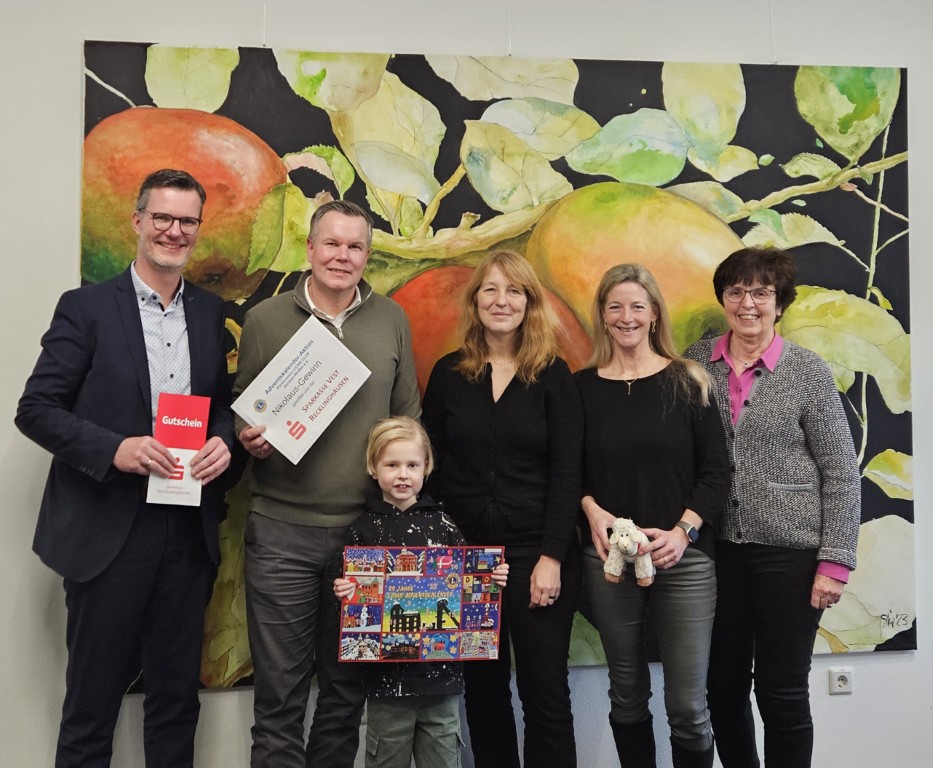 Mit seinem Sohn Emil nahm der Dorstener Hendrik Berkel (2.v.l.) den Nikolaus-Gewinn im Wert von 500€ in Empfang, den die Sparkasse Vest als Preis für den Adventskalender des Lions Clubs Dorsten-Wulfen gespendet hatte. Mit ihm freuten sich Marktbereichsdirektor Uwe Schniederjan, Club-Präsidentin Dr. Kathrin Pieren, Vize-Präsidentin Sabine Sonntag und Activity-Beauftragte Gudrun Gabriel (v.l.n.r.). Der Familienrat muss zwar noch tagen und sich für einen der drei zur Verfügung stehenden Preise entscheiden. Hendrik Berkel jedenfalls würde eine Fahrt mit dem Heißluftballon reizen, um Dorsten und Umgebung einmal aus der Vogelperspektive zu betrachten.