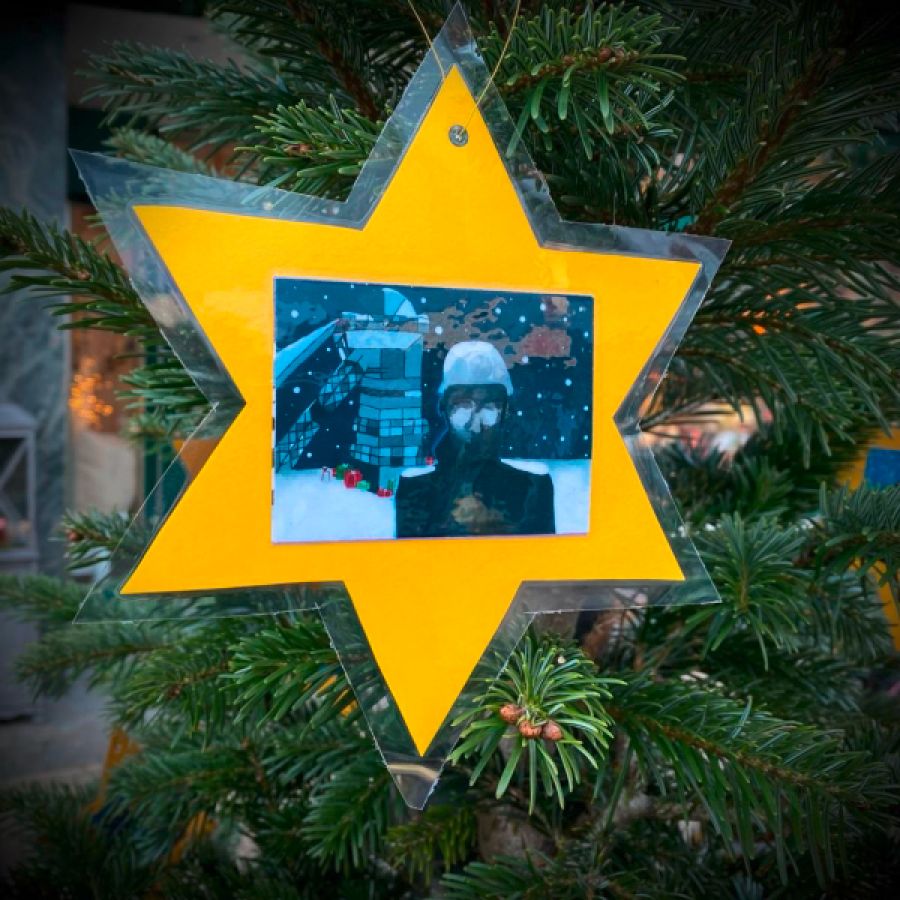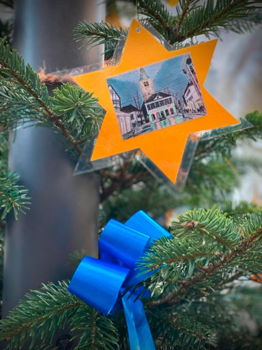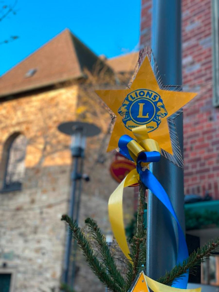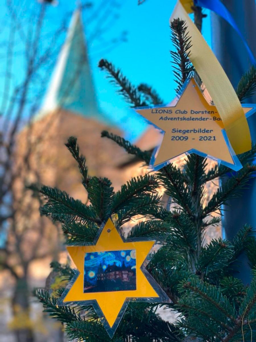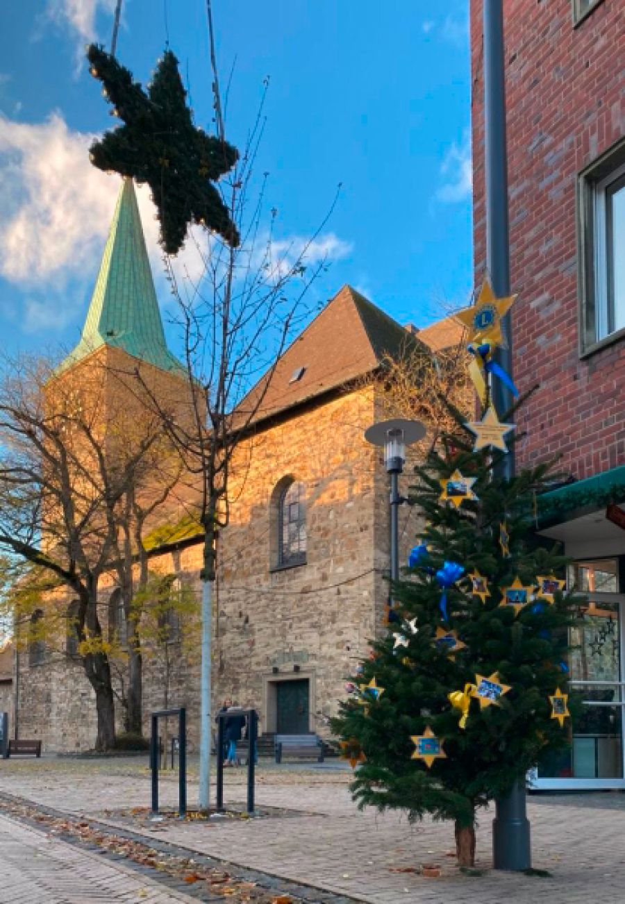 Geschmückt wurde der Baum mit gelben Sternen, auf denen die Titelbilder der Lions-Adventskalender aus den vergangenen 13 Jahren prangten. Gelbe und blaue Schleifen und das Lions-Symbol als Krone machten den Baum in der Recklinghäuser Straße zu einem Hingucker.